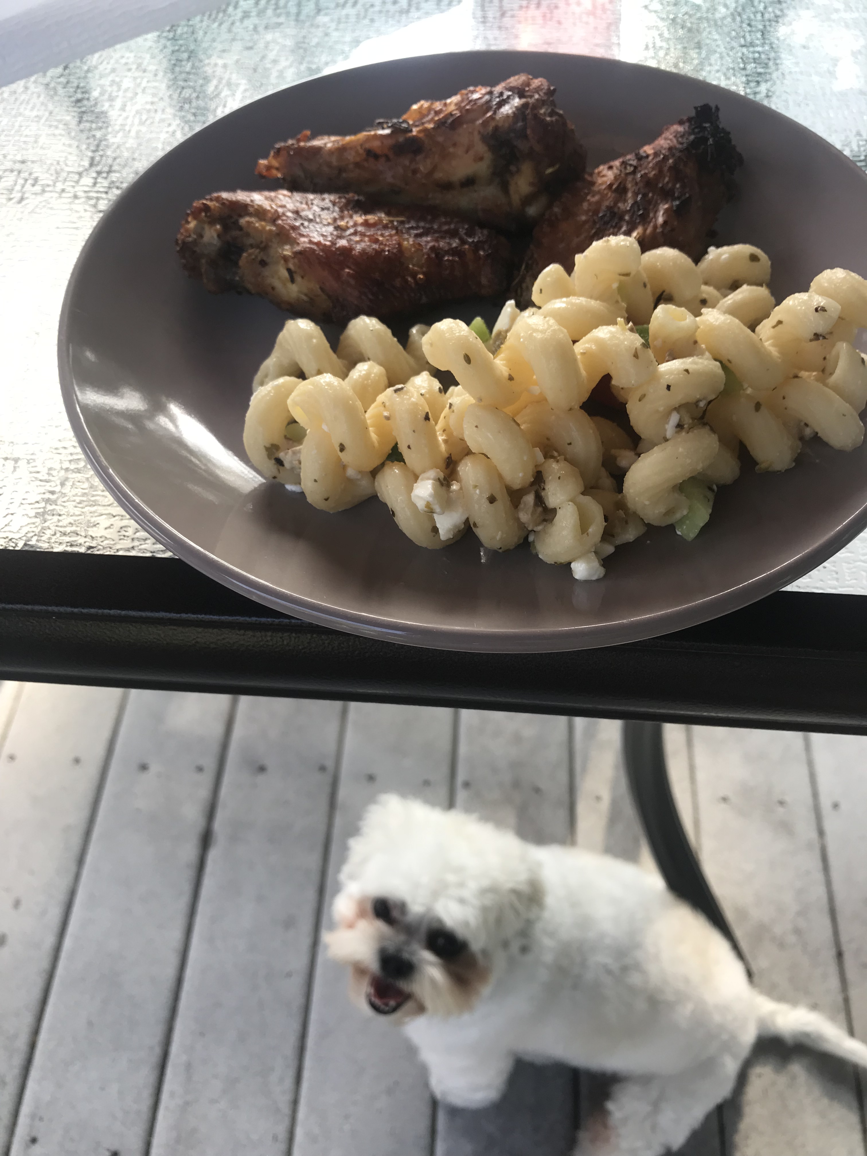 Chicken wings and pasta salad! (plus my dog begging for some)